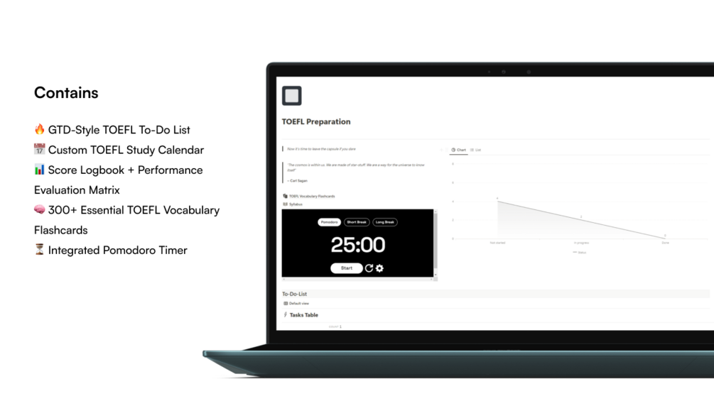 The Ultimate TOEFL Preparation Notion Template is a game-changer, designed to help you study smarter, stay organized, and track your progress effortlessly. Whether you're following a course or self-preparing, this all-in-one dashboard ensures maximum efficiency and better results.