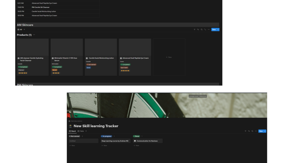 The Project 50 dashboard stands out for its aesthetic and functional design, free from unnecessary clutter. Its integrated databases ensure that your habits tracker, skincare, book notes template, and new skill learning tracker are all interconnected, providing you with maximum control and organization to complete this tough 50-day-long challenge.